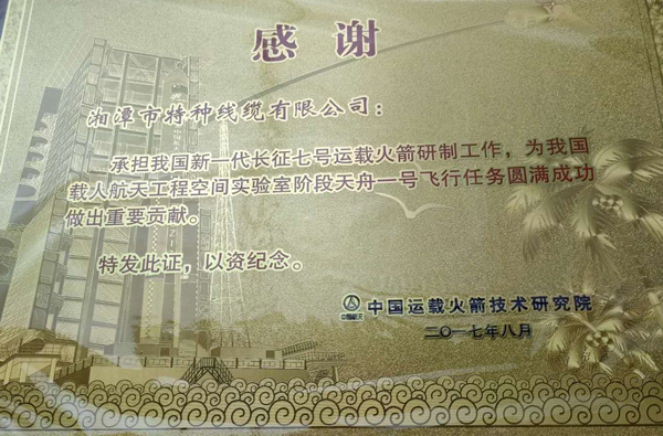 2011年9月29日,“神猴电缆”助力“天宫一号”,用长征二号F火箭将“天宫一号”目标器发射升空,同年,受到了中国载人航天工程办公室的表彰